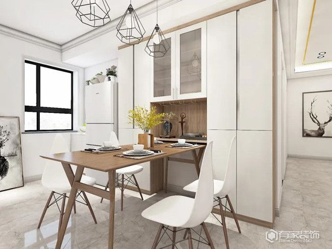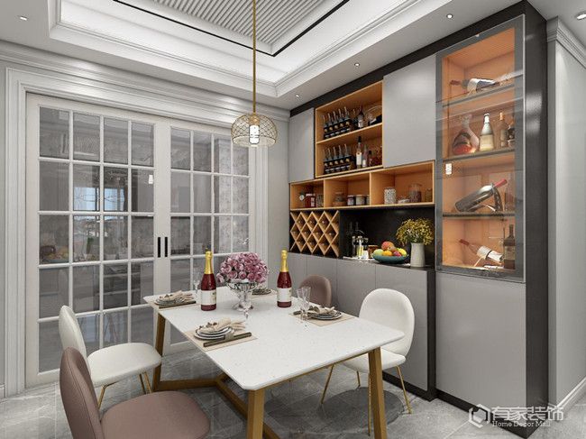 關于定制餐邊柜的方案,基本上都是根據餐廳的實際戶型靠墻做設計。為什么推薦做定制?根源就是為了充分利用好一切可以利用的空間,不浪費一寸寶貴的空間。不同于批量生產且內部構造一成不變的成品餐邊柜,定制餐邊柜的內部空間,可以按照自家需要做人性化設計,實用性方面更好。另外,定制餐邊柜建議做通頂設計。一方面,通頂設計的餐邊柜可以減少衛(wèi)生死角。畢竟,無論是成品餐邊柜還是沒有通頂的定制柜,頂部的裸露區(qū)域易落灰成為衛(wèi)生死角。另一方面,通頂設計的餐邊柜,也是進一步增加了餐廳收納,實用方面也是杠杠的。