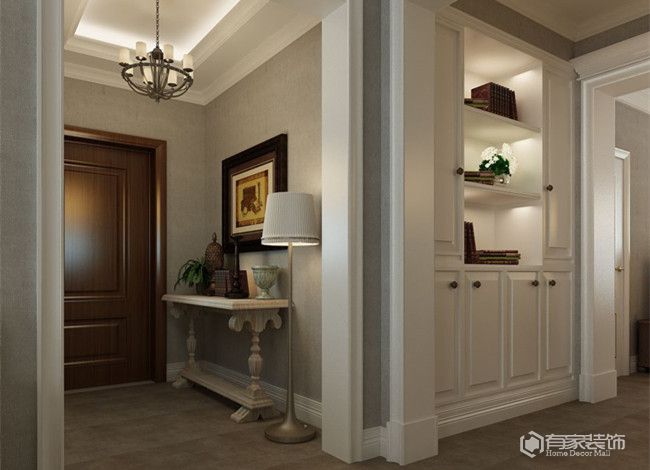 增加墻面層次感,也是玄關(guān)空間顯高的關(guān)鍵。關(guān)于玄關(guān)墻面層次感的打造方法,主要通過(guò)造型、色彩和光線等進(jìn)行合理設(shè)計(jì)。關(guān)于玄關(guān)墻面造型,顧名思義就是在腰線、條紋和高踢腳線等顯高元素的作用下,使得玄關(guān)墻面變得更加立體和具有層次感。至于色彩方面,就是盡可能降低玄關(guān)墻面色彩飽和度。簡(jiǎn)單來(lái)說(shuō),配色以淺色為主,增加墻面顏色的反射能力,進(jìn)而可以做到視覺(jué)上顯高的效果?;蛘哒f(shuō),頂面用淺色、地面用深色,強(qiáng)行拉開(kāi)頂?shù)氐囊曈X(jué)距離。還有顯高方法,就是玄關(guān)光線。盡可能突出高處墻面的明亮感,也有視覺(jué)上顯高的效果。